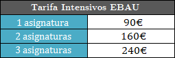 Para preparar las pruebas de Evaluación del Bachillerato y Acceso a la Universidad (EBAU), tenemos muy trabajados unos intensivos que son nuestra joya de la corona. Estos cursos intensivos están estructurados en tres semanas y en ellos hacemos un repaso exhaustivo de todo el curso. El alumno podrá matricularse de tantos cursos intensivos como asignaturas quiera prepararse con nosotros. Cada curso intensivo requiere de cuatro horas semanales de clase (un total de 12 horas durante sus tres semanas de duración). Además, en el intensivo hacemos simulacros de exámenes con correcciones para que cuando llegue el día de la verdad ya hayan dejado atrás miedos y nervios.
